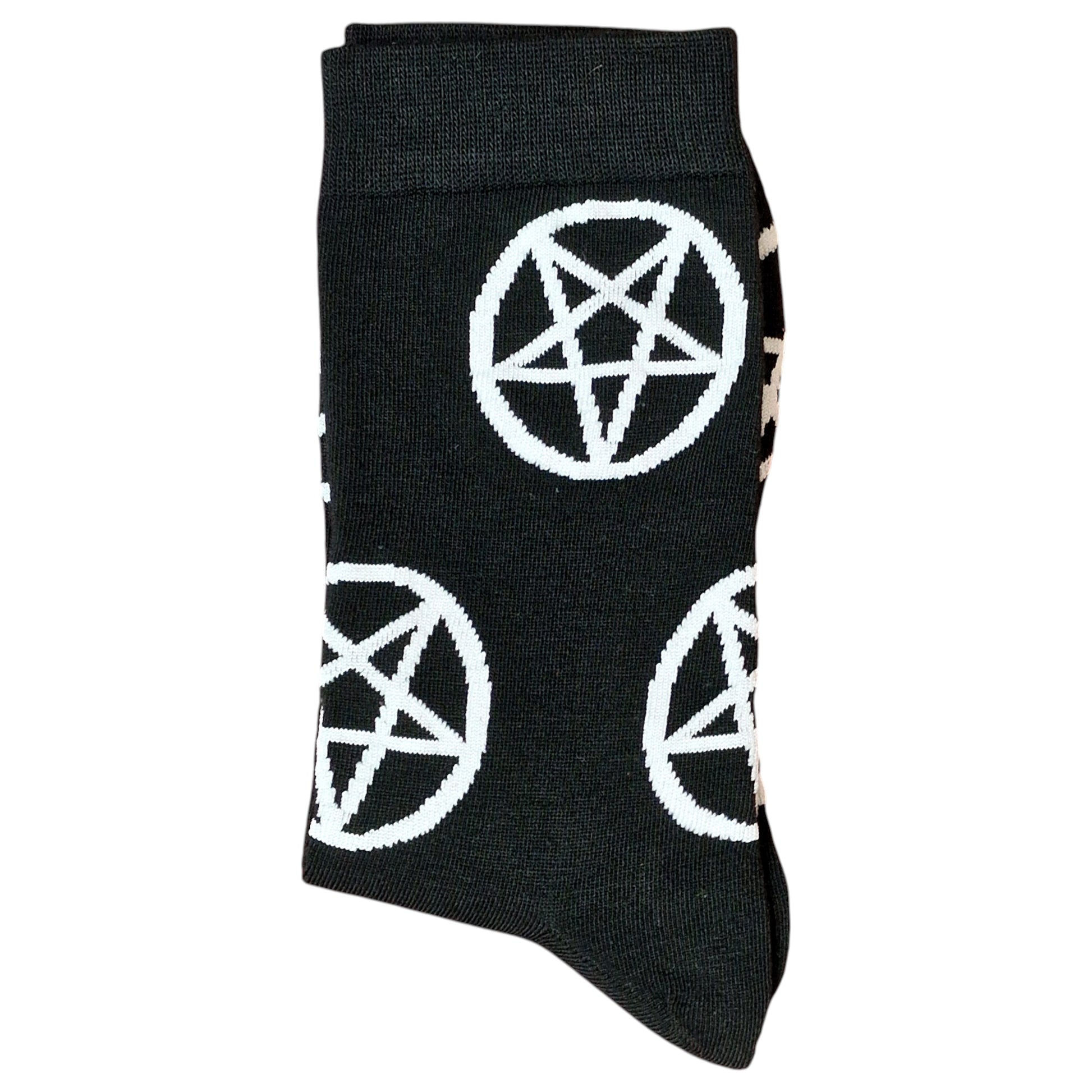 Occult Allure: Midnight Black With Magic White Pentagrams Ladies Socks