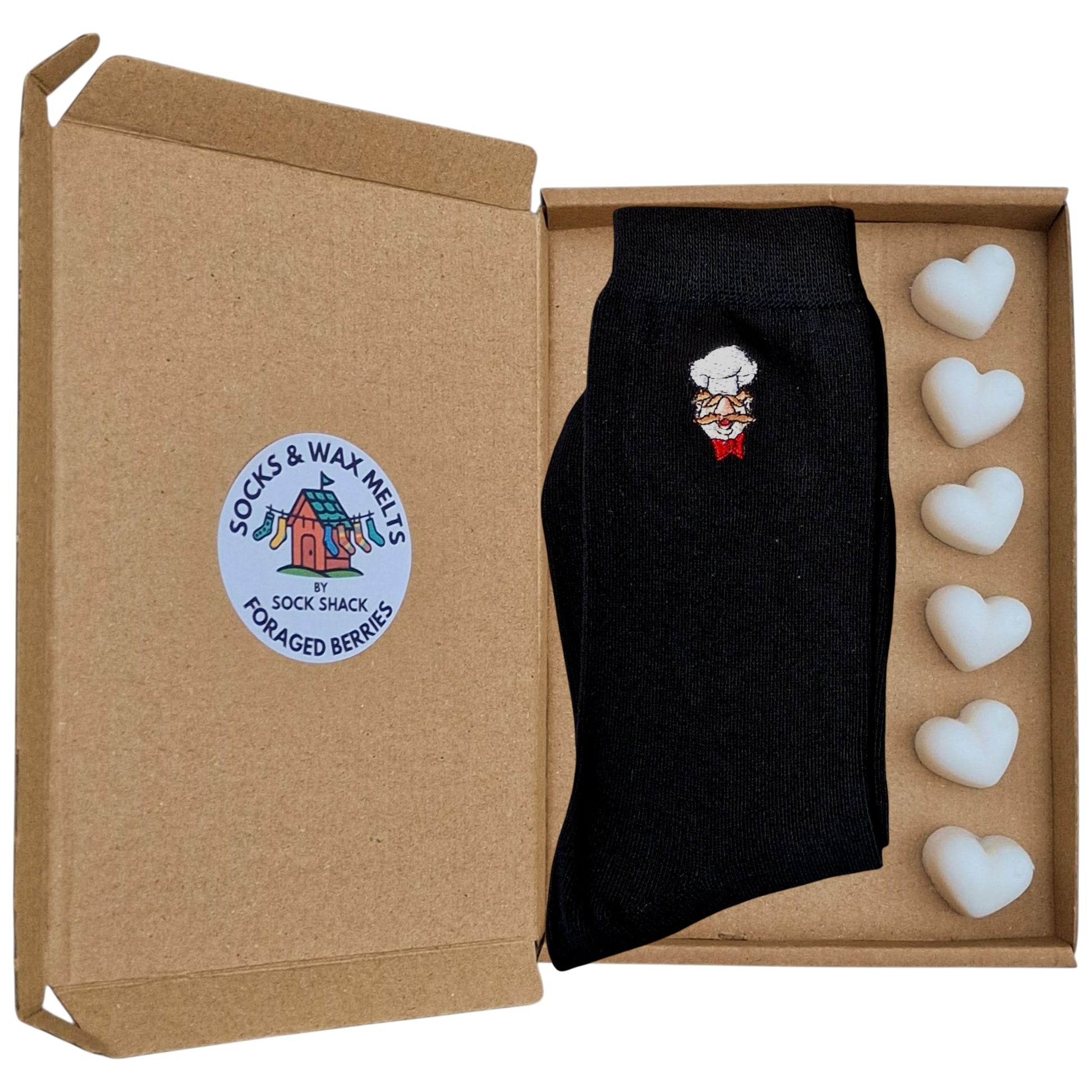 The Swedish Chef Embroidered Face Muppet Show Mens Black Socks & Wax Melts Gift Set