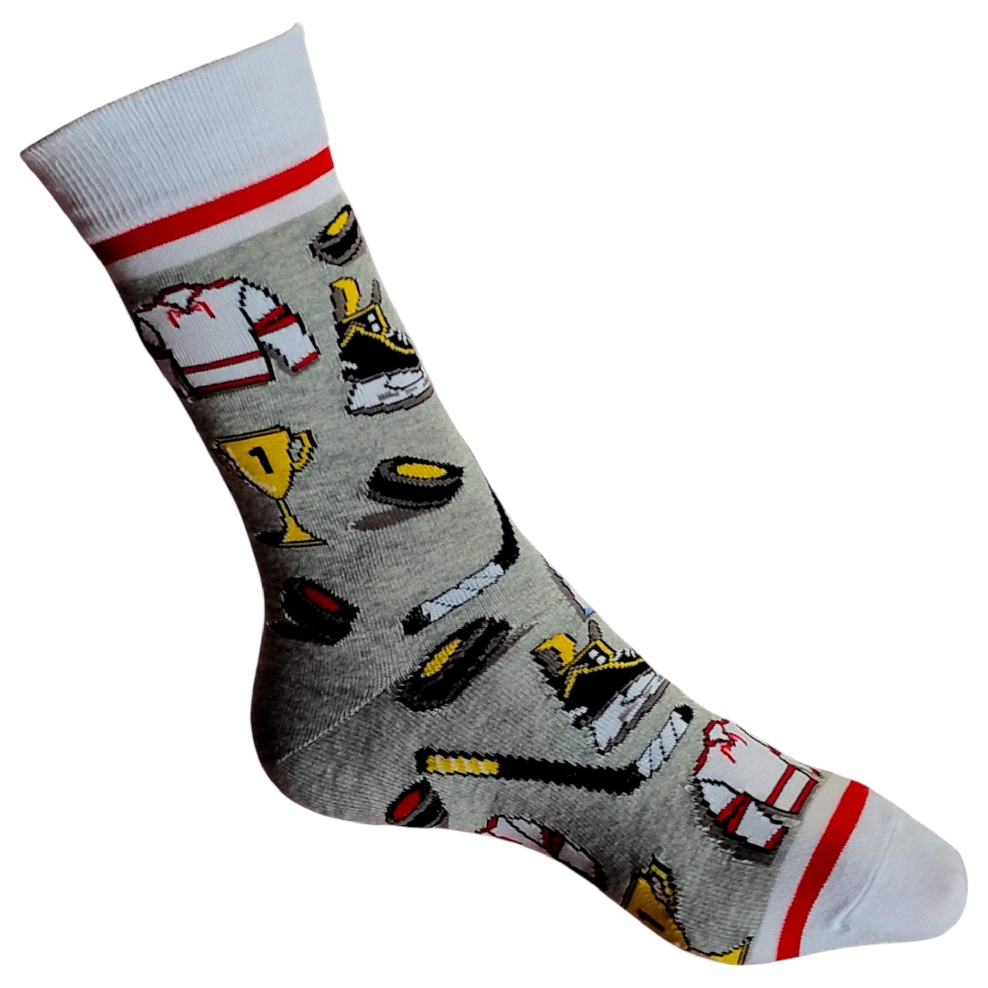 Hit the ice in style! These grey socks with white cuffs are packed with winning sticks, cool pucks, and awesome trophies. Goal!