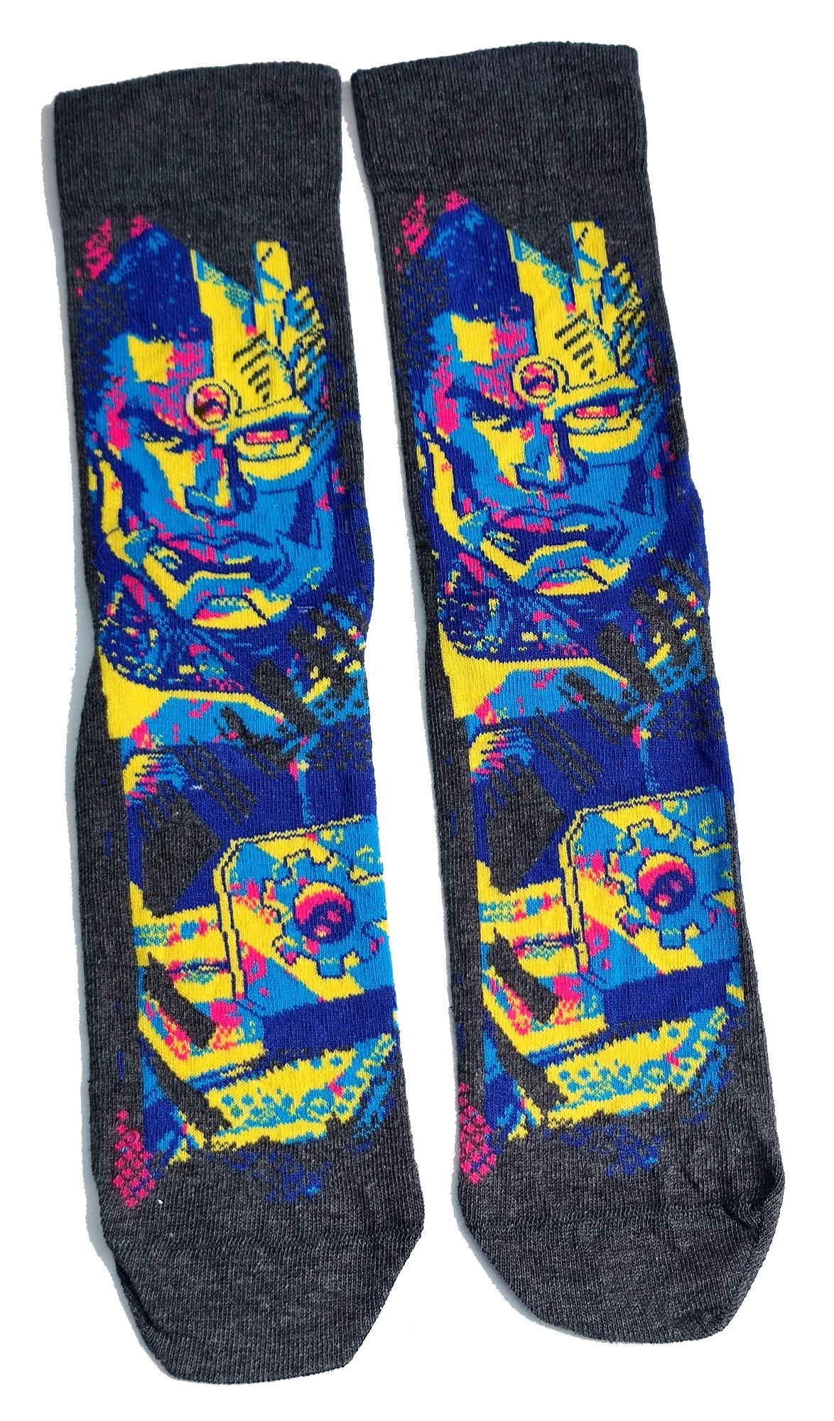 Unleash your inner superhero with these cyborg-themed grey socks, perfect for battles on the couch or in the office!